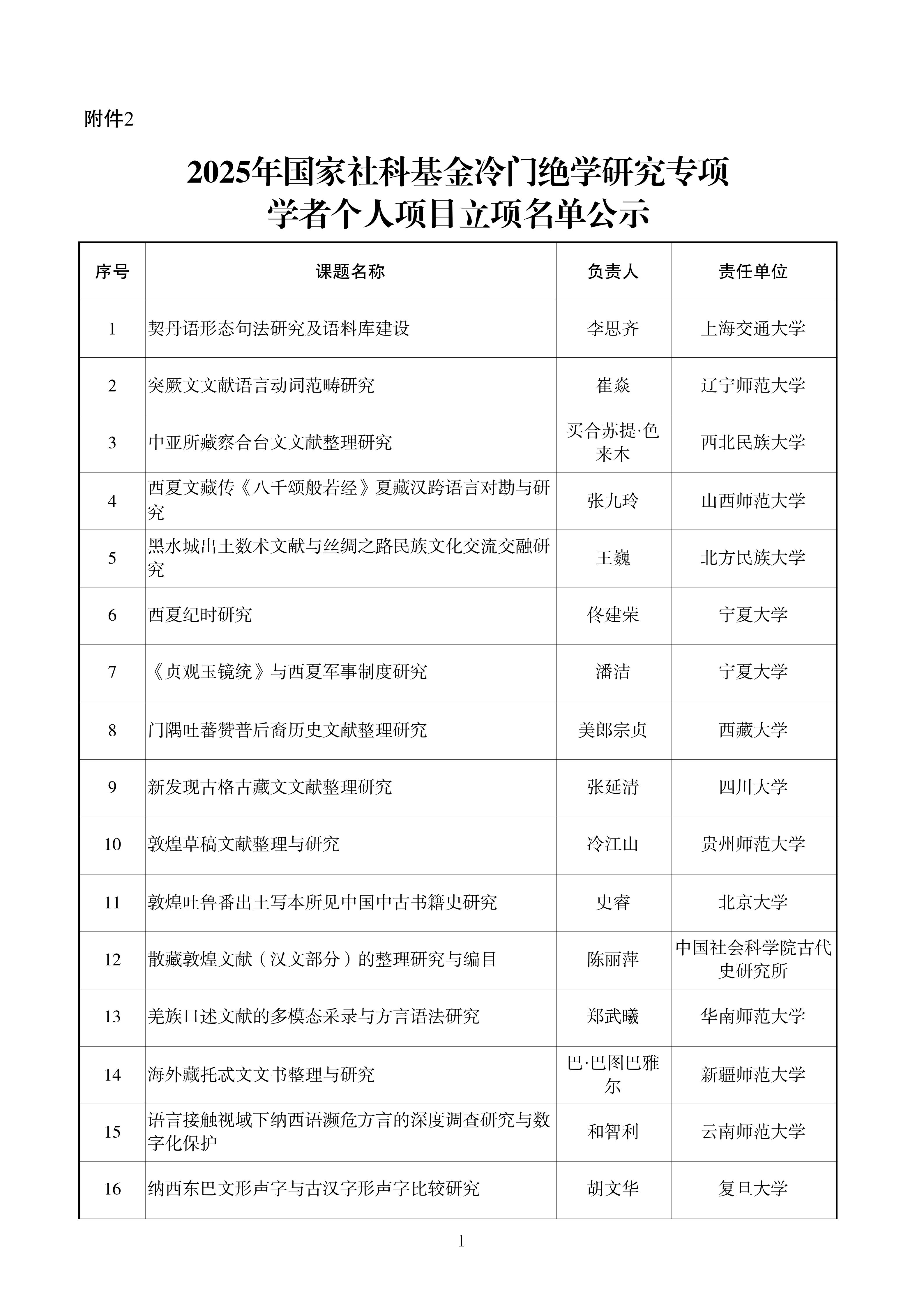 根据《国家社会科学基金管理办法》有关规定,现将2025年国家社科基金冷门绝学研究专项立项名单予以公示。公示时间为2026年1月12日至18日。公示期内,如有异议,请以书面方式向我办项目管理处反映,并提供必要的证据材料,以便核实查证。提出异议者须提供本人真实姓名、工作单位、联系电话等有效联系方式(我办将予以严格保密),凡匿名、冒名或超出期限的异议不予受理。